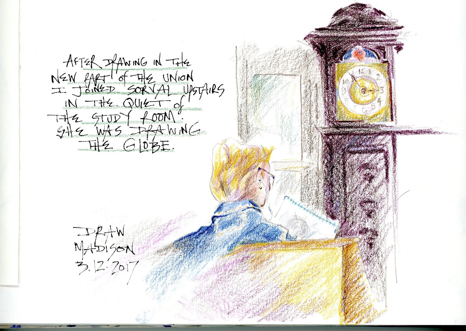I too was at the Union meet-up but needed to leave a bit early. I headed up to the second floor and found Sorval drawing the beautiful globe of the earth you see in the post below. This study room was so peaceful and quiet.